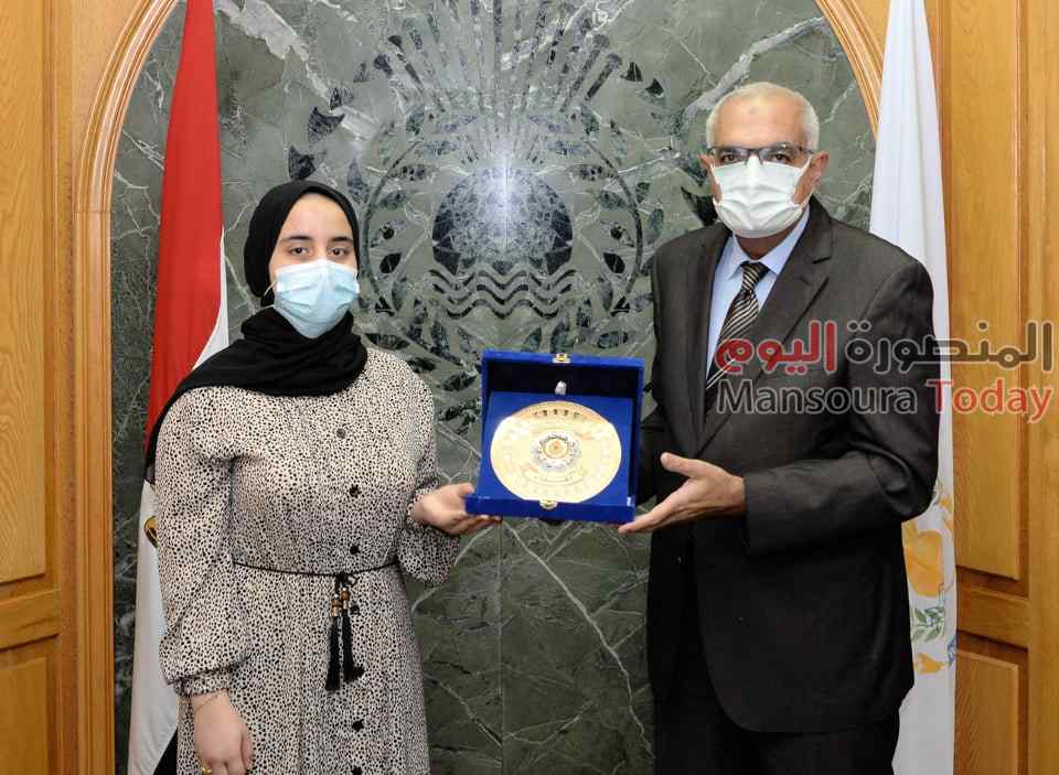 و أهداها الدكتور أشرف عبد الباسط درع التميز من الجامعة تقديرا لتفوقها الدراسى وأعلن عن تقديم منحة مجانية من المصروفات الدراسية لها للدراسة بكلية الطب بالجامعة، وتناول اللقاء حوارًا أبويًا بين رئيس الجامعة والطالبة عن طموحاتها المستقبلية ورغبتها في الالتحاق بكلية الطب ، مشيرة إلى تطلعها لأن تصبح طبيبة فى المستقبل .
