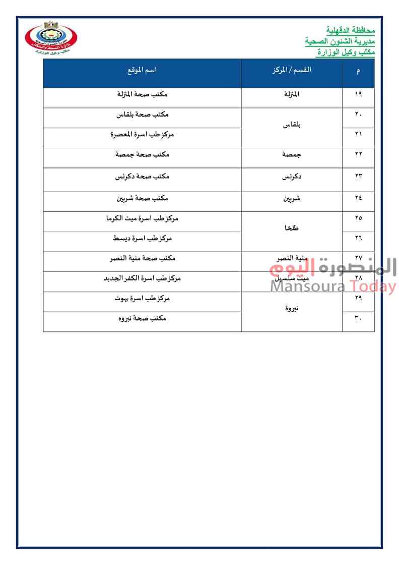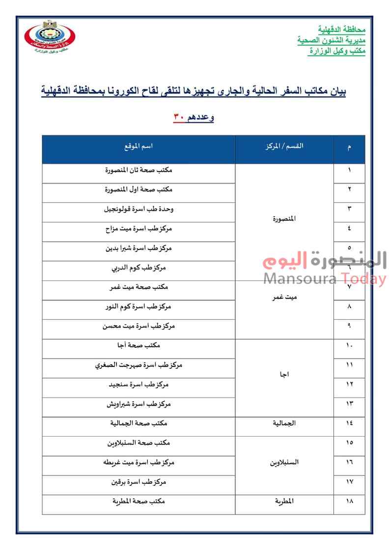 والجدير بالذكر أن المكاتب المخصصة لتطعيم المسافرين بلقاح كورونا وعددهم 30 مكتب هم ( مكتب صحة اول المنصوره – مكتب صحة ثاني المنصوره – وحدة طب أسرة قولنجيل – مركز طب أسرة ميت مزاح – مركز طب أسرة شبرا بدين – مركز طب كوم الدربي – مكتب صحة ميت غمر – مركز طب أسرة كوم النور – مركز طب أسرة ميت محسن – مكتب صحة اجا – مركز طب أسرة صهرجت الصغري – مركز طب أسرة سنجيد – مركز طب أسرة شبراويش – مكتب صحة الجماليه – مكتب السنبلاوين – مركز طب أسرة ميت غريطه – مركز طب أسرة برقين – مكتب صحة المطريه – مكتب صحة المنزله – مكتب صحة بلقاس – مركز طب أسرة المعصره – مكتب صحة جمصه – مكتب صحة دكرنس – مكتب صحة شربين – مركز طب أسرة ميت الكرما – مركز طب أسرة ديسط – مكتب صحة منية النصر – مركز طب أسرة الكفر الجديد – مركز طب أسرة بهوت – مكتب صحة نبروه ).