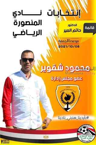 صرح محمود شقوير المرشح لعضوية مجلس إدارة نادي المنصورة الرياضي على قائمة الدكتور حاتم المير، أن القائمة في حال نجاحها، ستسعي بكل جهد للاهتمام بالألعاب الفردية، ودعمها، وتوفير افضل المدربين، وتسخير كافة الامكانيات لتخريج أبطال ينضمون للمنتخبات القومية، ويمثلون مصر في الالولمبياد، و المحافل الدولية. جائت تصريحات شقوير على هامش احتفالية تكريم ابطال السباحة بالنادي في مختلف الأعمار السنية، والتي اقيمت على حمام السباحة بنادي المنصورة الرياضي، بحضور أعضاء قائمة المير وهم: الحاج حاتم المير رئيس. الاستاذ عادل رجب نائب. الاستاذ وليد خطاب امين صندوق. الاستاذ محمد صلاح عضو. الاستاذ مجدي الشافعى. الاستاذ محمدابراهيم عضو. الحاج محمود شقوير عضو. الاستاذ محمد رشدي عضو. الدكتور علاء ابوالفتوح عضو. الدكتور طارق جاد عضو.