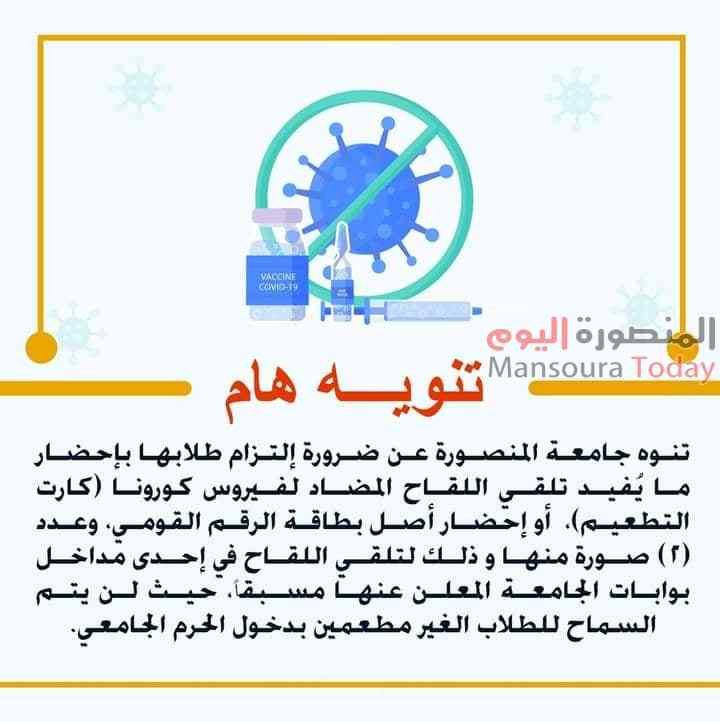 “تنوة جامعة المنصورة عن ضرورة التزام طلابها بإحضار مايفيد تلقي اللقاح المضاد لفيرس كورونا (كارت التطعيم ) أو إحضار اصل بطاقة الرقم القومي وعدد2صورة منها وذلك لتلقي اللقاح في إحدى بوابات الجامعة المعلن عنها مسبقا، حيث لن يتم السماح للطلاب الغير مطعمين بدخول الحرم الجامعي. ”