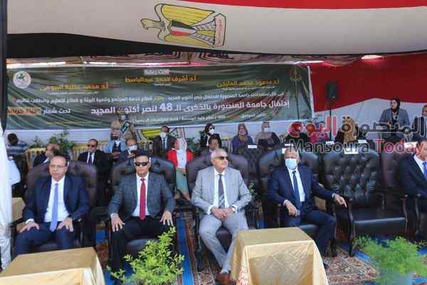 أقامت جامعة المنصورة اليوم الاثنين احتفالية كُبرى بنصر أكتوبر، في إطار احتفالات جامعة المنصورة بالذكرى الـ 48 لانتصارات أكتوبر المجيدة شهد الاحتفال الدكتور ايمن مختار محافظ الدقهلية والدكتور أشرف محمد عبد الباسط – رئيس الجامعة، والدكتور محمود محمد المليجي – نائب رئيس الجامعة لشئون خدمة المجتمع، و محمد عطية البيومي – نائب رئيس الجامعة لشئون التعليم والطلاب، وذلك بقاعة المؤتمرات الكبرى بالإدارة العامة للجامعة. وبحضور عدد من أبطال حرب أكتوبر ومصابي وأسر شهداء العمليات العسكرية والإرهابية من القوات المسلحة والشرطة. تضمن الاحتفال طابور عرض عسكري مُقدم من طلاب الجامعة المُشاركين في التربية العسكرية، وكذلك فقرات فنية خاصة بمواهب مبادرة حياة كريمة، بالإضافة إلى كلمات لممثلي القوات المسلحة والشرطة مع عرض فيديو عن تضحيات القوات المسلحة والشرطة.