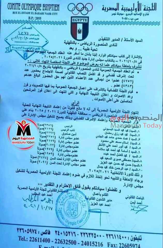 اللجنة الأولمبية المصرية تعتمد نتيجة انتخابات نادي المنصورة والمجلس الجديد يعقد اول اجتماعاته