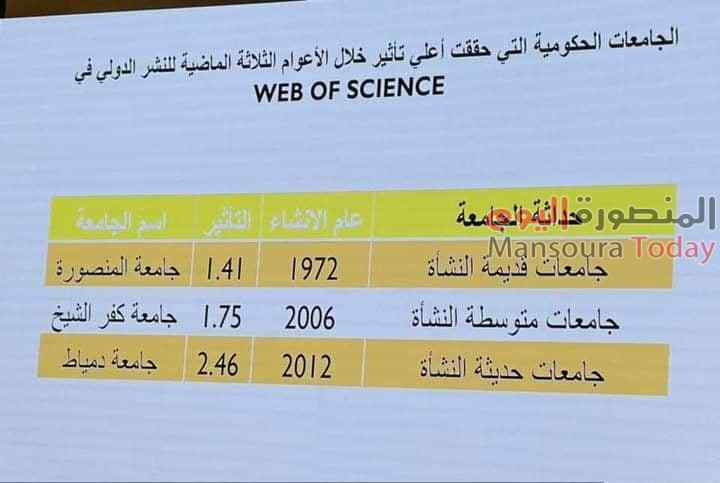 تسلم الدكتور أشرف عبد الباسط رئيس جامعة المنصورة اليوم جائزة المركز الاول خلال احتفالية تكريم الجامعات المصرية المتميزة ( قديمة النشأة ) في النشر الدولي والتي ساهمت بإجمالي تأثير مرتفع للنشر العلمي، في موقع web of science، خلال الأعوام الثلاثة السابقة للنشر الدولي والتي تأتى في إطار التعاون بين المجلس الأعلى للجامعات وبنك المعرفة.