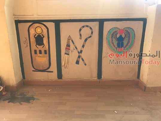 قام طلاب كلية السياحة والفنادق بجامعة المنصورة بتجميل جدران الكلية من خلال رسم إبداعات فنية تعبر عن الحضارة المصرية.