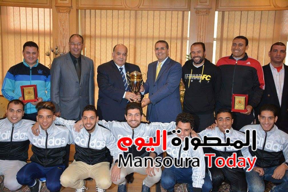 تقدم حسام الدين إمام محافظ الدقهلية، والدكتور محمد القناوى رئيس جامعة المنصورة، لتكريم أعضاء فريق كرة القدم الخماسية بالجامعة لفوزه بالمركز الأول وكاس أحسن لاعب بالبطولة العربية الثانية عشر لكرة القدم الخماسية المقامة بجامعة جنوب الوادي بقنا.